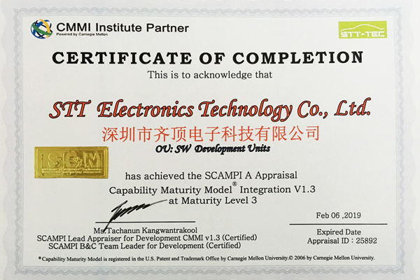 2016年1月份,在齊頂科技CMMI3級(jí)認(rèn)證結(jié)果發(fā)布會(huì)上,主任評(píng)估師宣布:深圳市齊頂電子科技有限公司已經(jīng)達(dá)成了CMMI3級(jí)目標(biāo),成功通過CMMI3級(jí)認(rèn)證。這是齊頂電子在軟件開發(fā)和管理標(biāo)準(zhǔn)方面發(fā)展的里程碑,標(biāo)志著公司的軟件能力成熟度和項(xiàng)目管理水平與國際主流模式接軌。