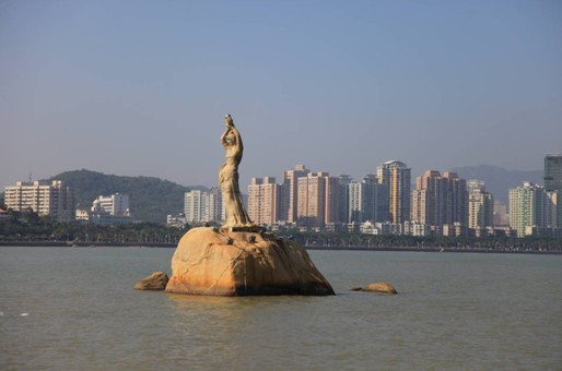 在聆聽導(dǎo)游關(guān)于漁女的傳說中,來到了香爐灣畔,親臨觀賞珠海漁女像----她領(lǐng)戴項珠,身掮魚網(wǎng),褲腳輕挽,雙手高高擎舉著一顆晶瑩璀璨的珍珠,帶著喜悅而又含羞的神情,向世界昭示著光明,親眼目睹使人覺得比傳說更加優(yōu)美,漁女像與情侶路已經(jīng)成為珠海的象征!